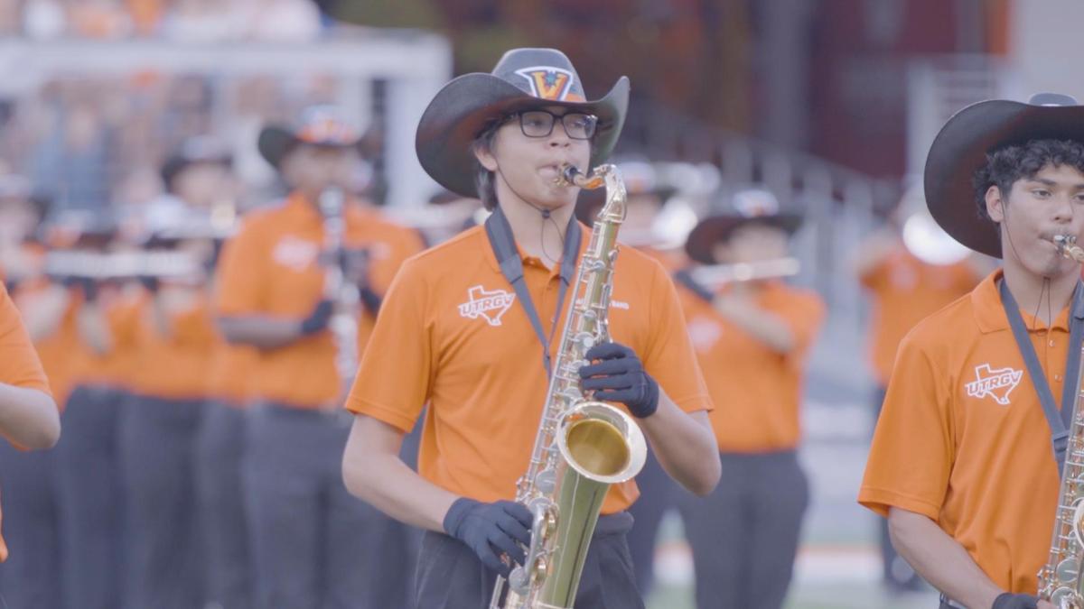 MISSION, TEXAS (SEPT. 24, 2025) — Kobe Rojas, a proud 2025 graduate of Veterans Memorial High School (VMHS), is helping make history at the University of Texas Rio Grande Valley (UTRGV) as a founding member of the university’s inaugural Vaquero Marching Band.