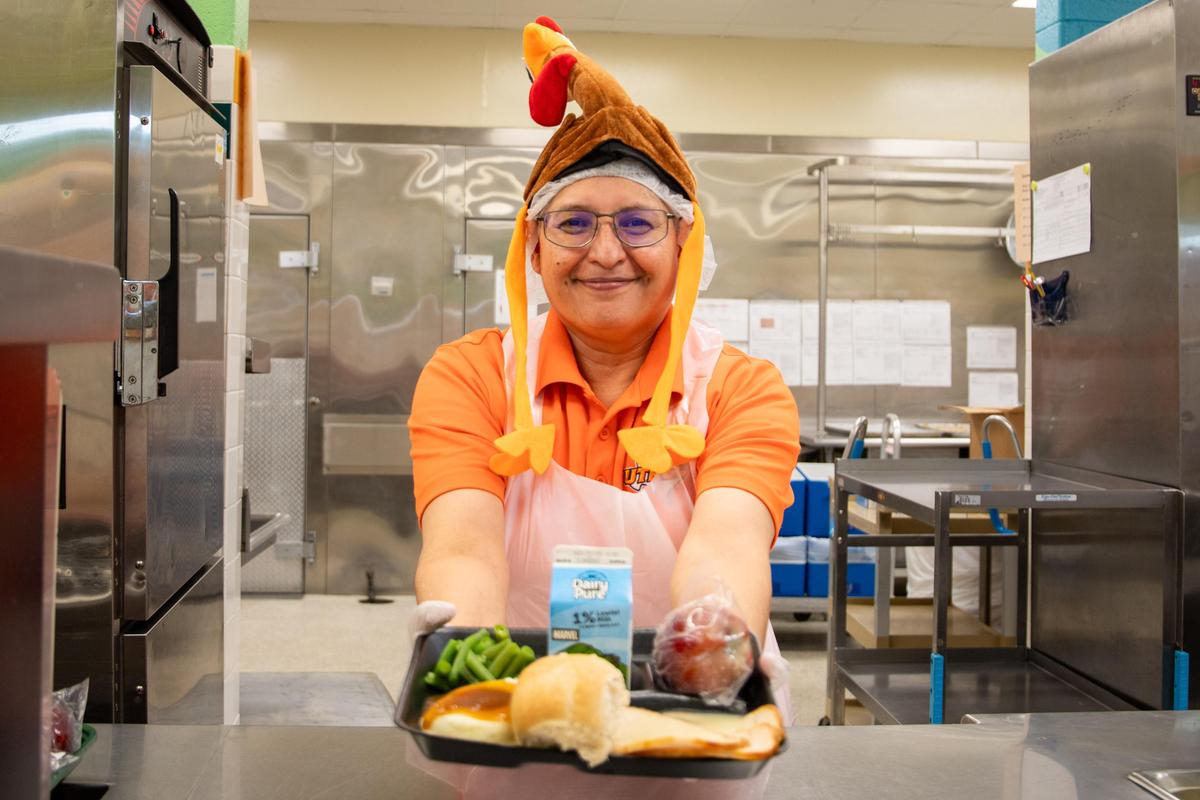 Her work spans breakfast and lunch services for pre-K through fifth grade, following recipes, maintaining strict safety procedures, and coordinating with her team to keep meal service running smoothly.