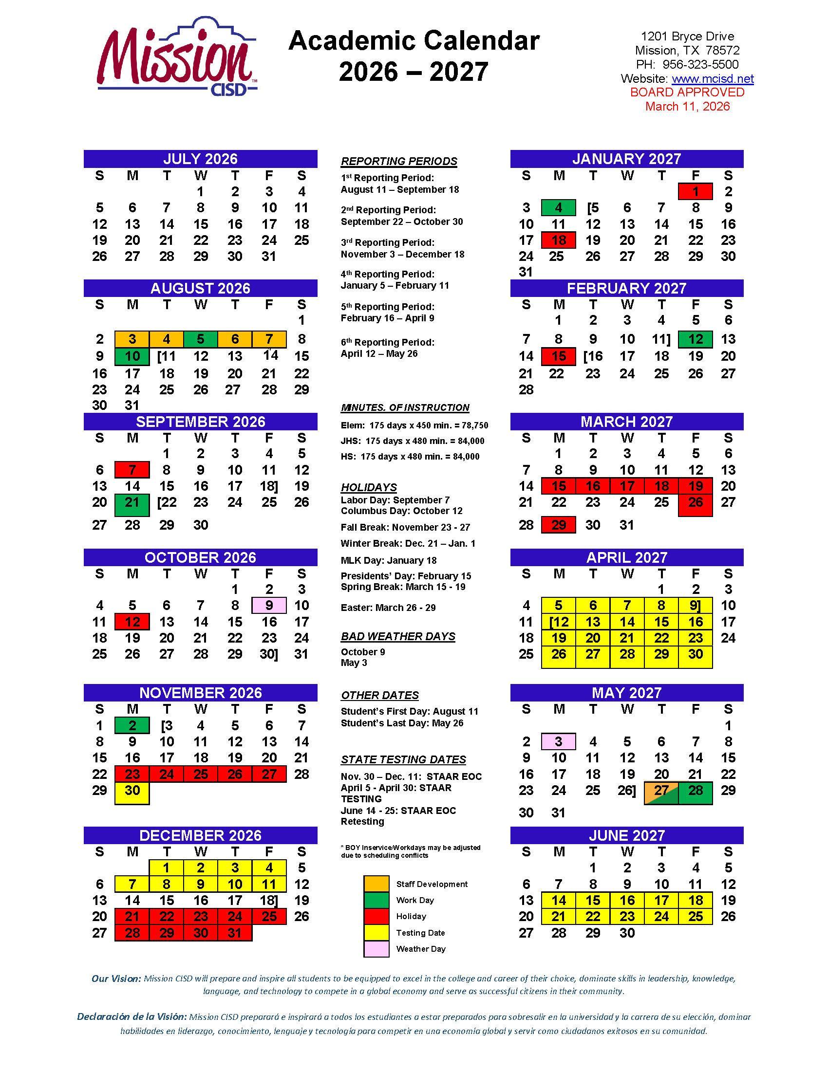 The 2026-2027 Mission CISD academic calendar has been approved.